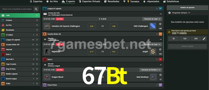 O 67Bt oferece uma grande seleção de opções de apostas em e-sports com probabilidades competitivas